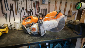 In the image is a Stihl TS410 brought to me because the exhaust had fallen off and the water way through the guard adjustment handle had broken. The operative continued to use the saw regardless of the noise coming from the exhaust as it worked its way off.